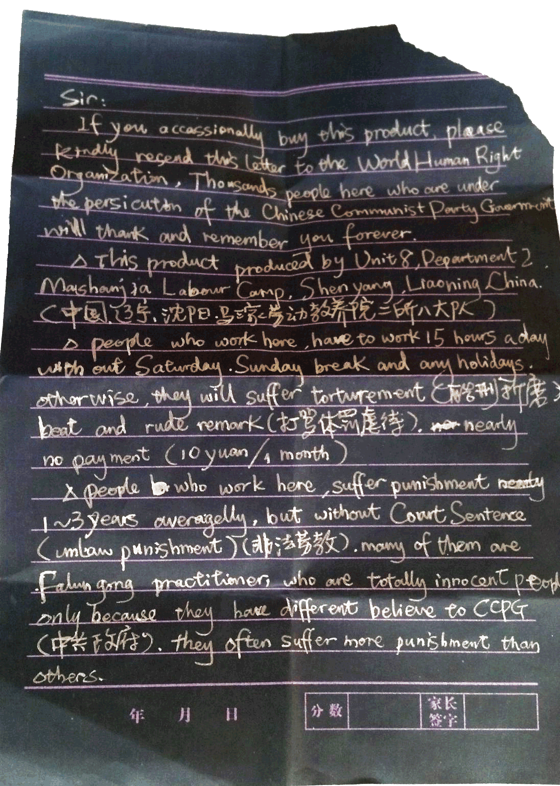 In 2012, a box of Halloween decorations was purchased at a Kmart in the United States by a woman named Julie Keith. Inside the box was found a letter written by a labour camp prisoner from Masanjia Labor Camp in Shenyang, China.